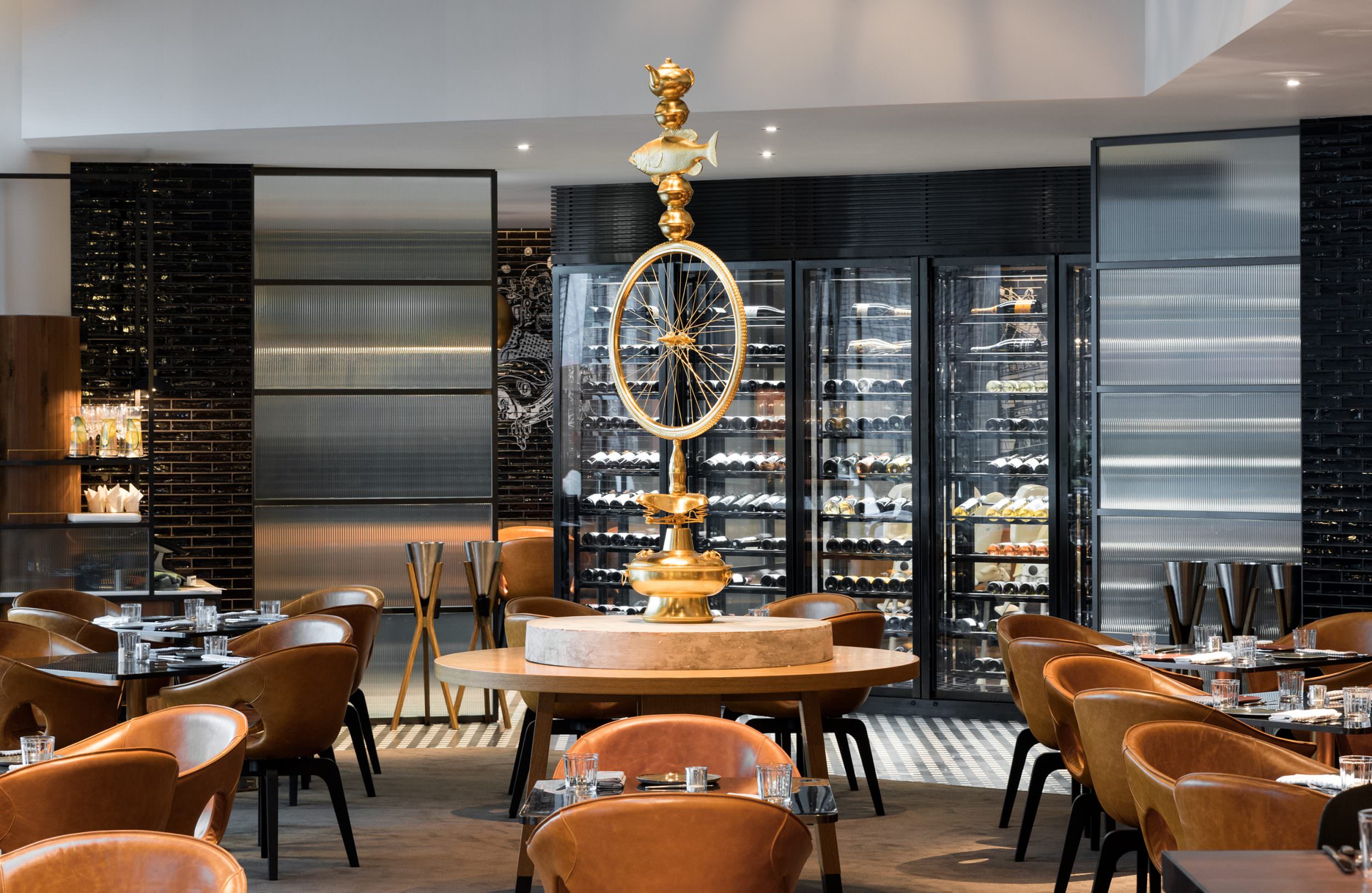 前台的镜面和黄铜万花筒定制装置设计,形象体现酒店所载区域的文化多元性与影响力。